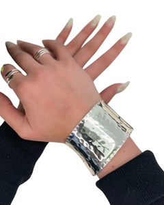 This Silver Plated Hammered Wide Cuff is the bold statement piece that transforms your entire look. The wide band design commands attention, while the hammered texture catches the light from every angle, adding depth and artisanal character to your wrist.